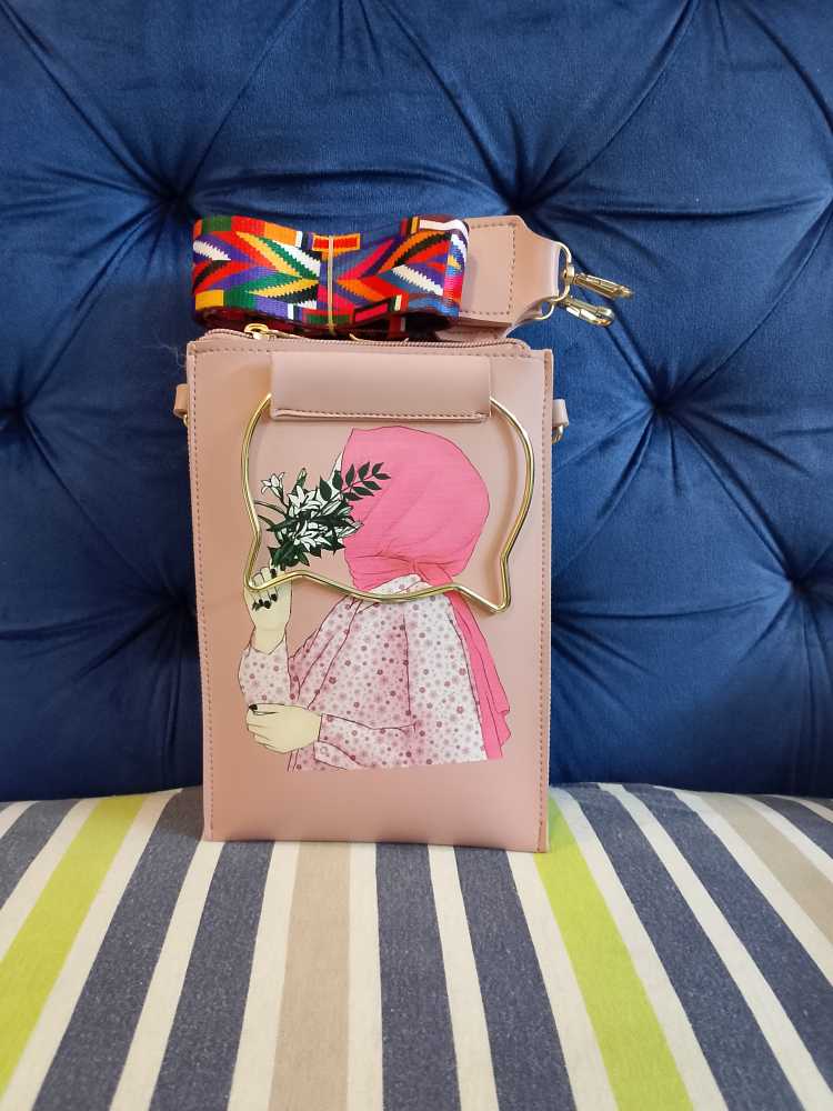 Elevate your daily essentials with this stunning fusion of art and fashion. Designed for the modern woman who values both style and modesty, this vertical phone crossbody features a minimalist, soft-toned illustration of a woman in a pink hijab holding fresh white lilies.