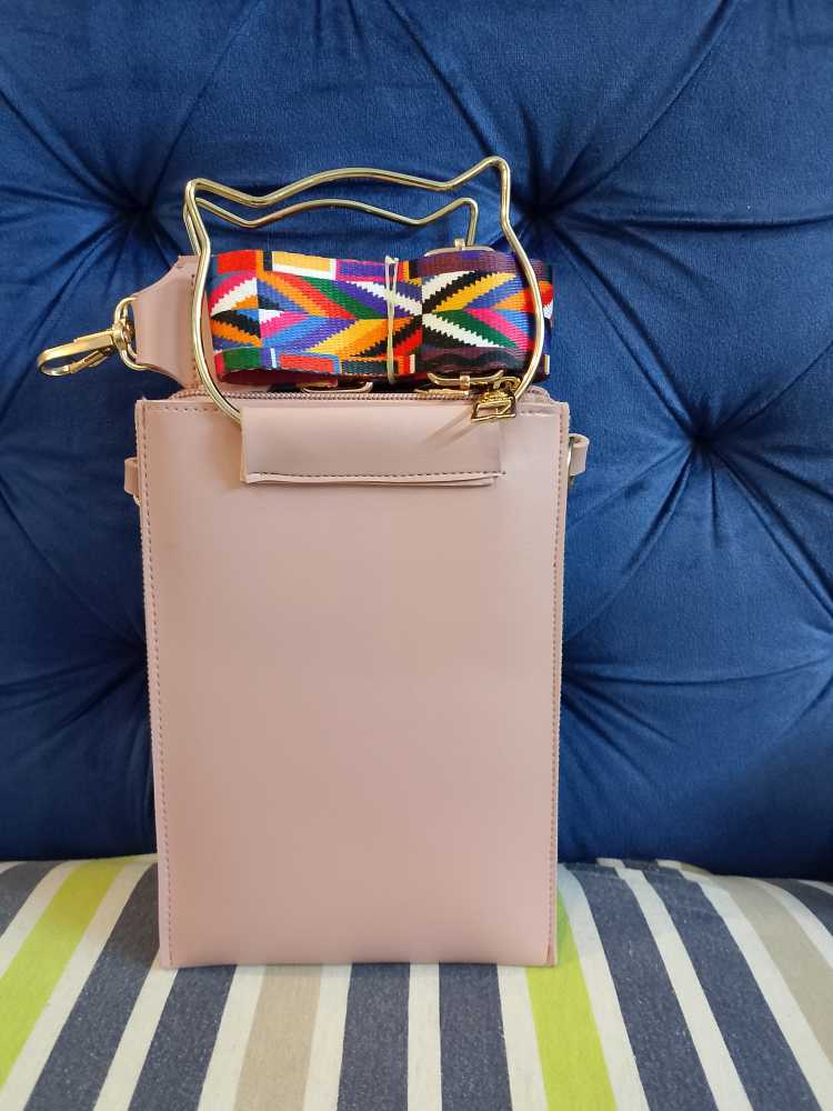 The bag’s soft blush pink body is accented by a striking gold-finished frame, giving it a structured, premium look. To add a contemporary edge, it comes paired with a vibrant, multi-colored geometric guitar strap that is both comfortable for all-day wear and a bold style statement. Lightweight, functional, and uniquely expressive, it’s the perfect companion for errands, travel, or brunch dates.