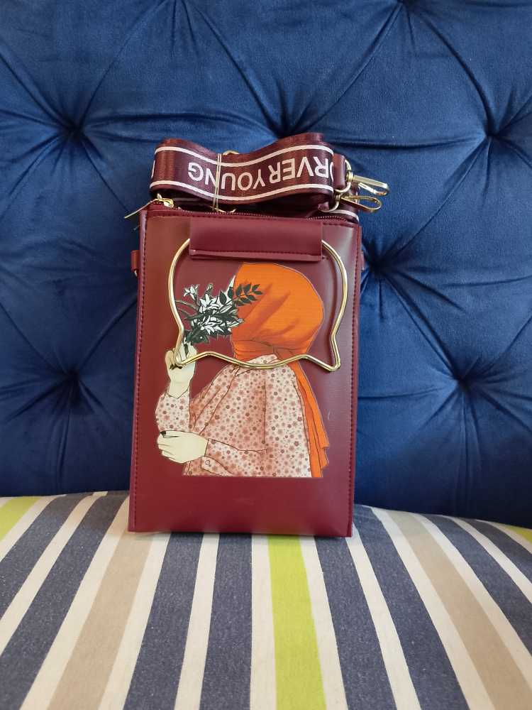 Rich, bold, and full of character, the Deep Burgundy edition is designed for those who want their accessories to make a statement. This vertical crossbody features a striking illustration of a woman in a vibrant sunset orange hijab, creating a warm and energetic focal point against the dark wine-colored base.