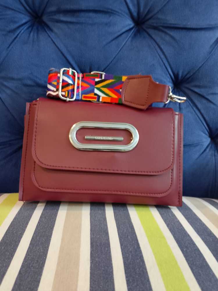 Bold Crimson Crossbody Bag – Structured Flap Handbag with Multi-Color Ethnic Webbing Strap & Silver Hardware