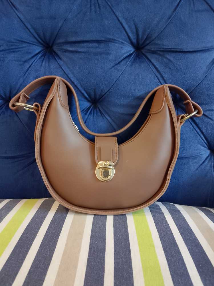 Minimalist Tan Crescent Hobo Bag – Sleek Half-Moon Shoulder Bag with Gold Hardware